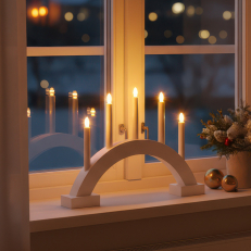 Arch-shaped advent candle holder in wood with classic design. The five LED lights emit a warm white glow that creates a soft and atmospheric light. The candle holder is battery-operated, making it perfect for windows, shelves, or table settings or other places where power outlets are absent. Made from FSC®-certified wood from sustainable forestry.