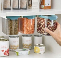 Hang the three containers in the grooves under the rail. Easy to pull out and put in the containers when you need them.