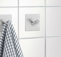 Self-adhesive square single hook in brushed stainless steel. Simple and fast! Set up a hook and help keeping everything tidy and create order. With a good adhesive the hook needs no tools to be put up. -