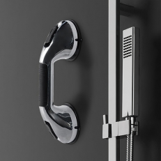 A shower handle is a practical aid for the bathroom that provides extra support when you need to get up from the toilet or go in and out of the shower and bathtub. The handle is attached to the wall with strong suction cups and the locking mechanism creates a vacuum against the tile which means that the handle is firmly attached.
